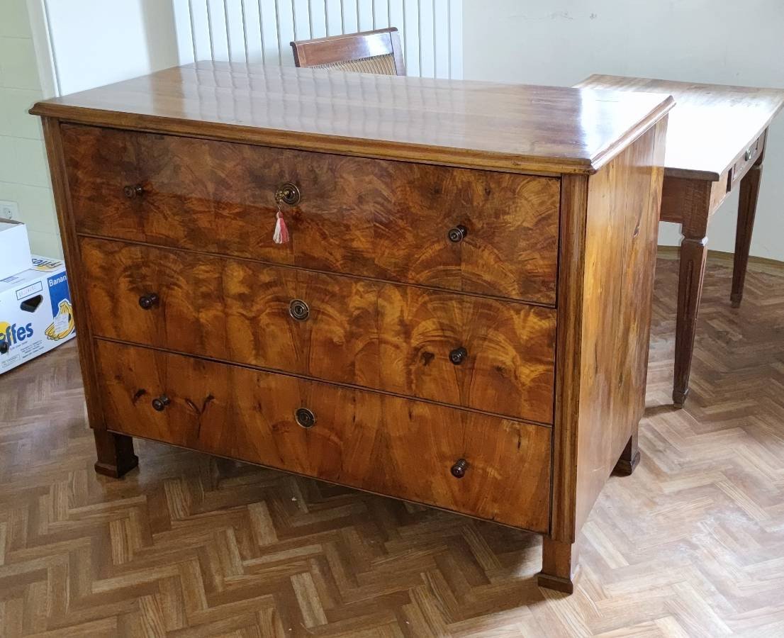 Kommode frühes Biedermeier, spätes Empire. Ausgezeichneter Zustand, nicht renovierungsbedürftig, mit Schellack von Hand poliert. Korpus Fichte, Nussfurnier.