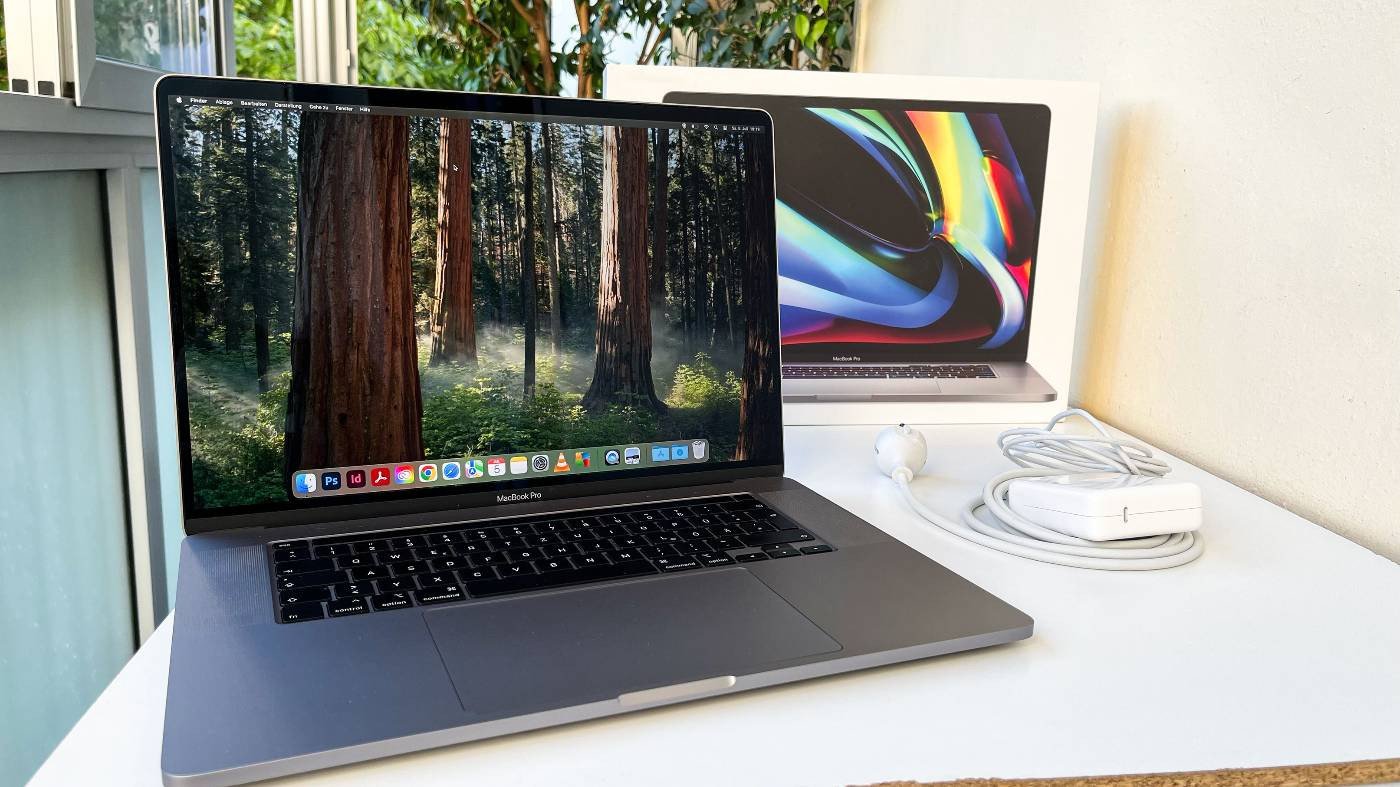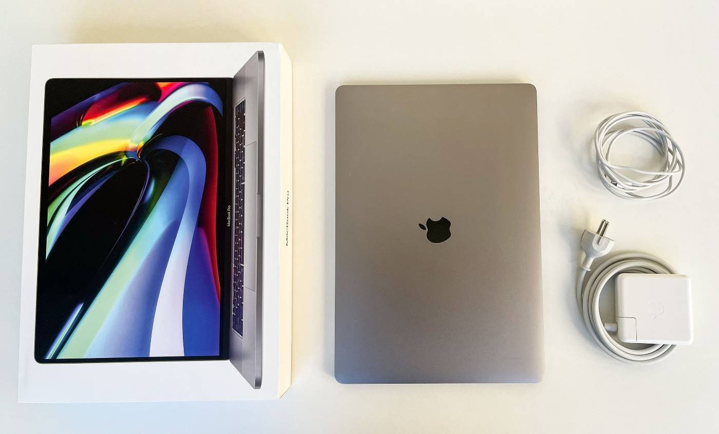MacBook Pro gebraucht in sehr gutem Zustand mit großem und hochauflösendem 16-Zoll-Bildschirm von 2019, deutsches Tastatur-Layout (QWERTZ) und doppelte Grafikkarte.