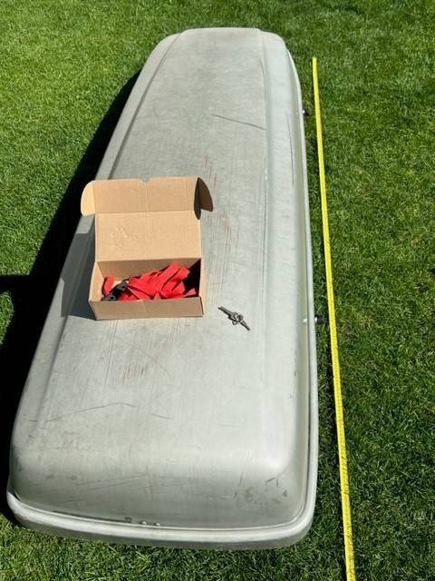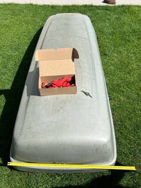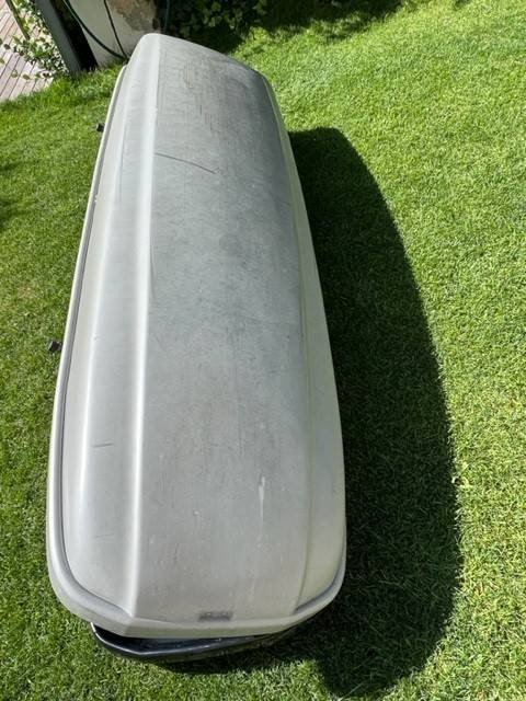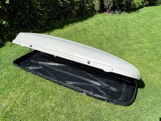 Dach Box Kamei, 400 l, grau, alle Zusatzteile und zwei Schlüssel vorhanden, kann auf jedem Dachquerträger montiert werden, Inhalt lässt sich mit zwei Schnellverschlussgurten bequem festzurren