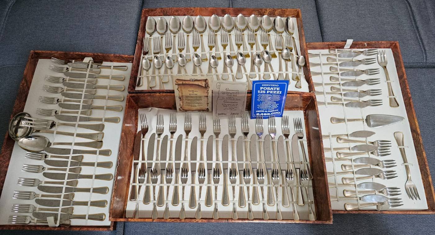 Zum Verkauf steht ein exklusives Besteckset mit 125 Teilen, hergestellt aus 18/10 Edelstahl und zusätzlich mit 24 Karat "Oro zecchino" - Vergoldung veredelt.