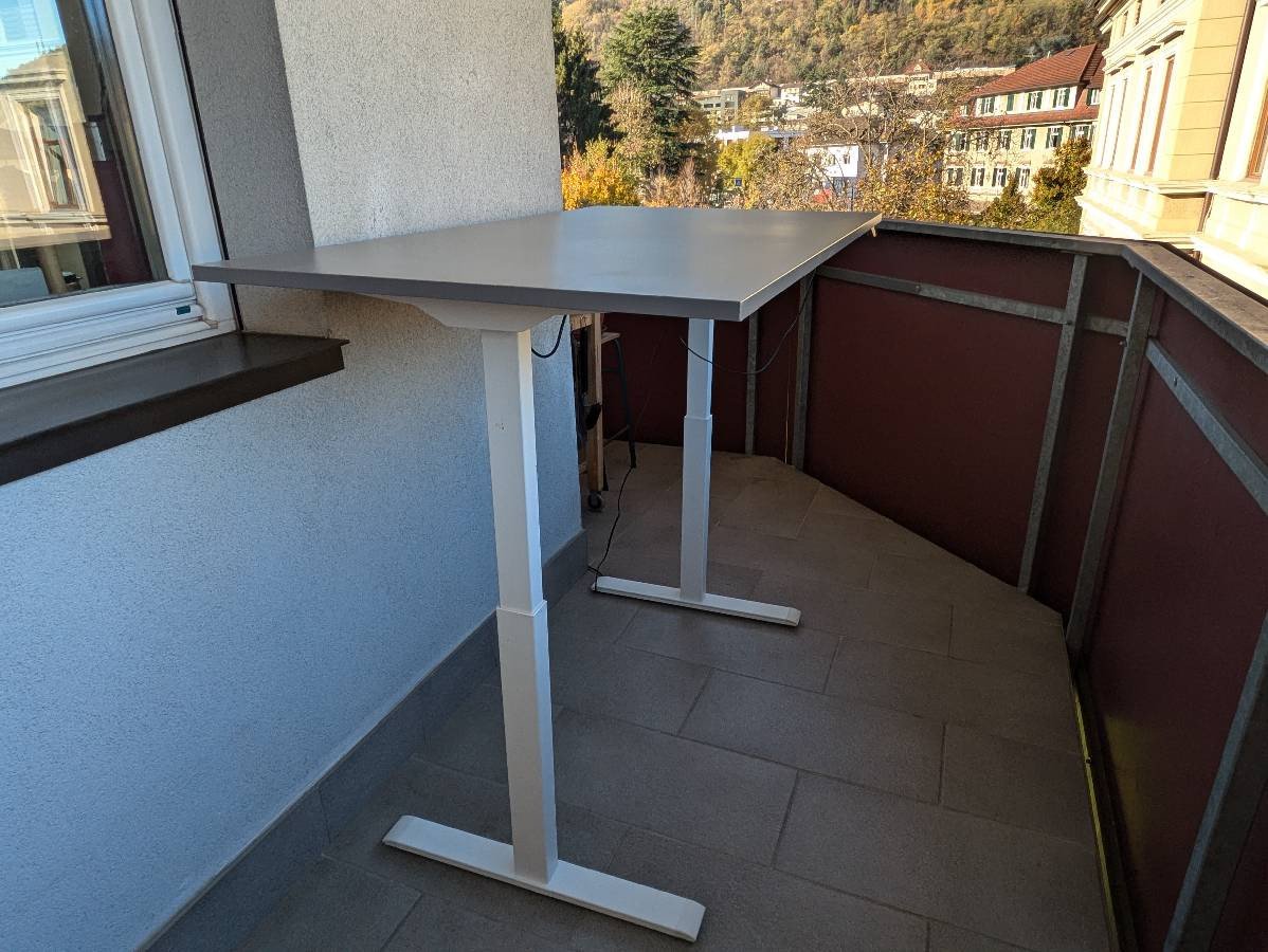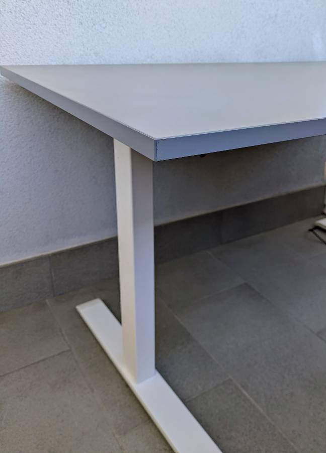 Verkaufe höhenverstellbaren IKEA Rodulf Schreibtisch, grau-weiß, elektrisch einstellbar zwischen 70 cm und 117 cm Höhe.