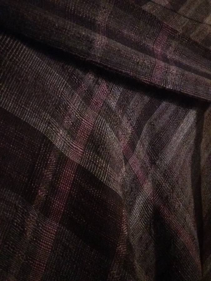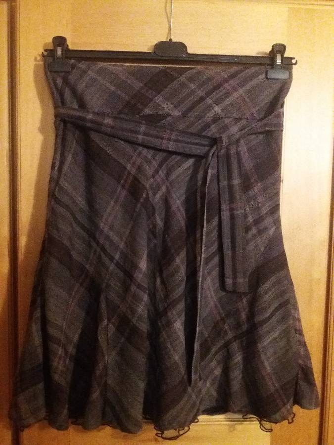 Grau-lila-violett karierter Rock in A-Linie. Mit Bindeband und violettem Futter mit schwarzem Tüllrand, der unterm Saum hervorlugt.