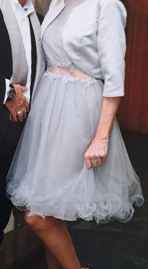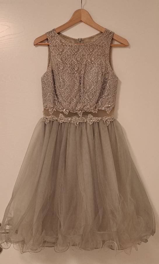 Elegante abito da sera/da cocktail, taglia 36 (D), 42 (IT), in una splendida tonalità grigio argento. La combinazione di pizzo e tulle conferisce all'abito un tocco femminile e raffinato; include un bolero in raso. È perfetto per le occasioni speciali e attirerà sicuramente tutti gli sguardi. Le condizioni sono ottime, poiché è stato indossato solo una volta.