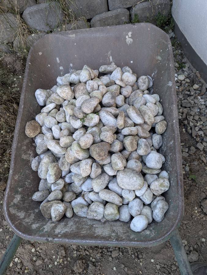 Eine Schubkarre voll weißer Steine. Sie waren bei mir im Garten als Ziersteine und ich brauch sie nicht mehr