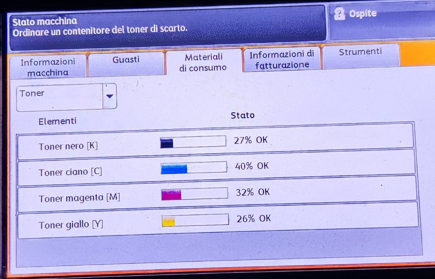 Verbrauchsmaterial / Toner: Schwarz: 27%, Cyan 40%, Magenta 32%, Gelb 26%, Resttonerbehälter ist bald zu ersetzten.