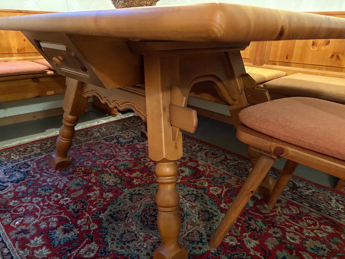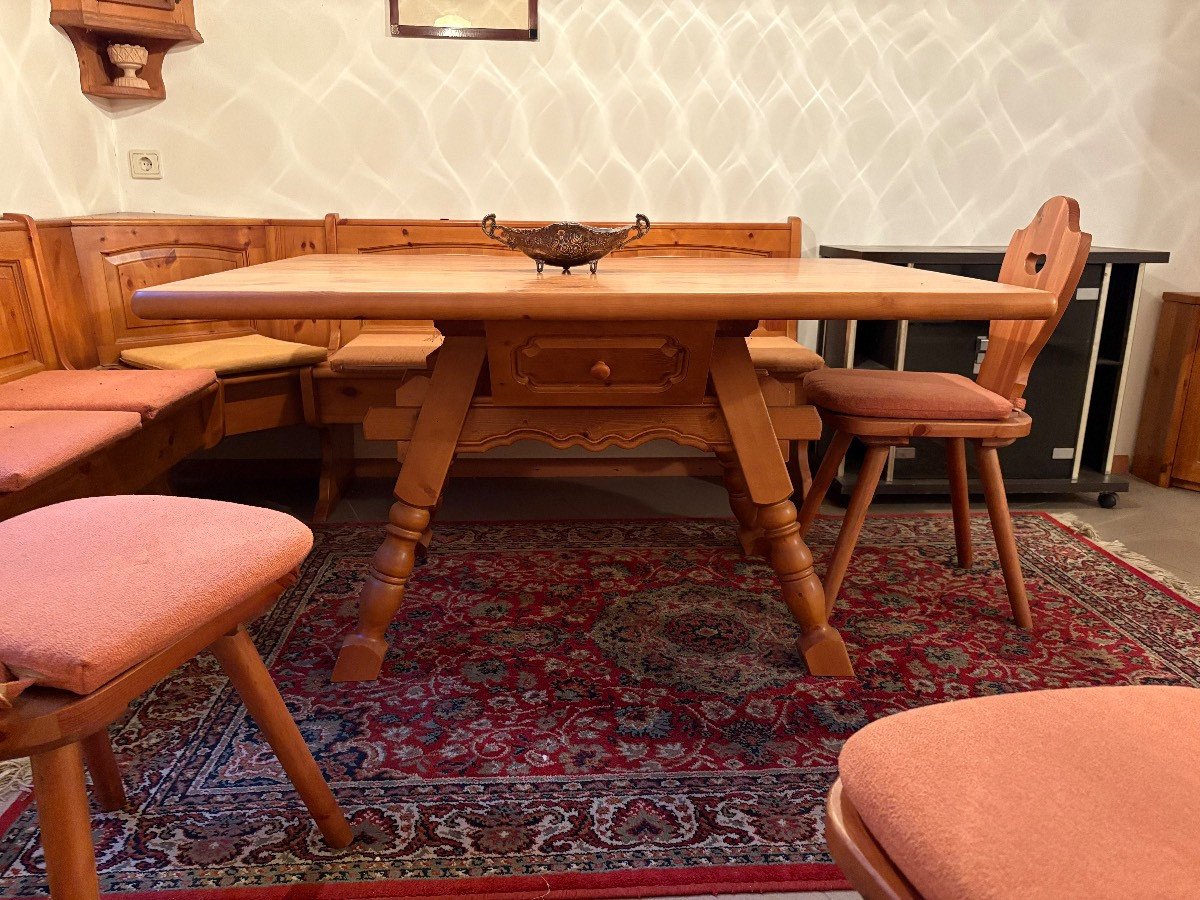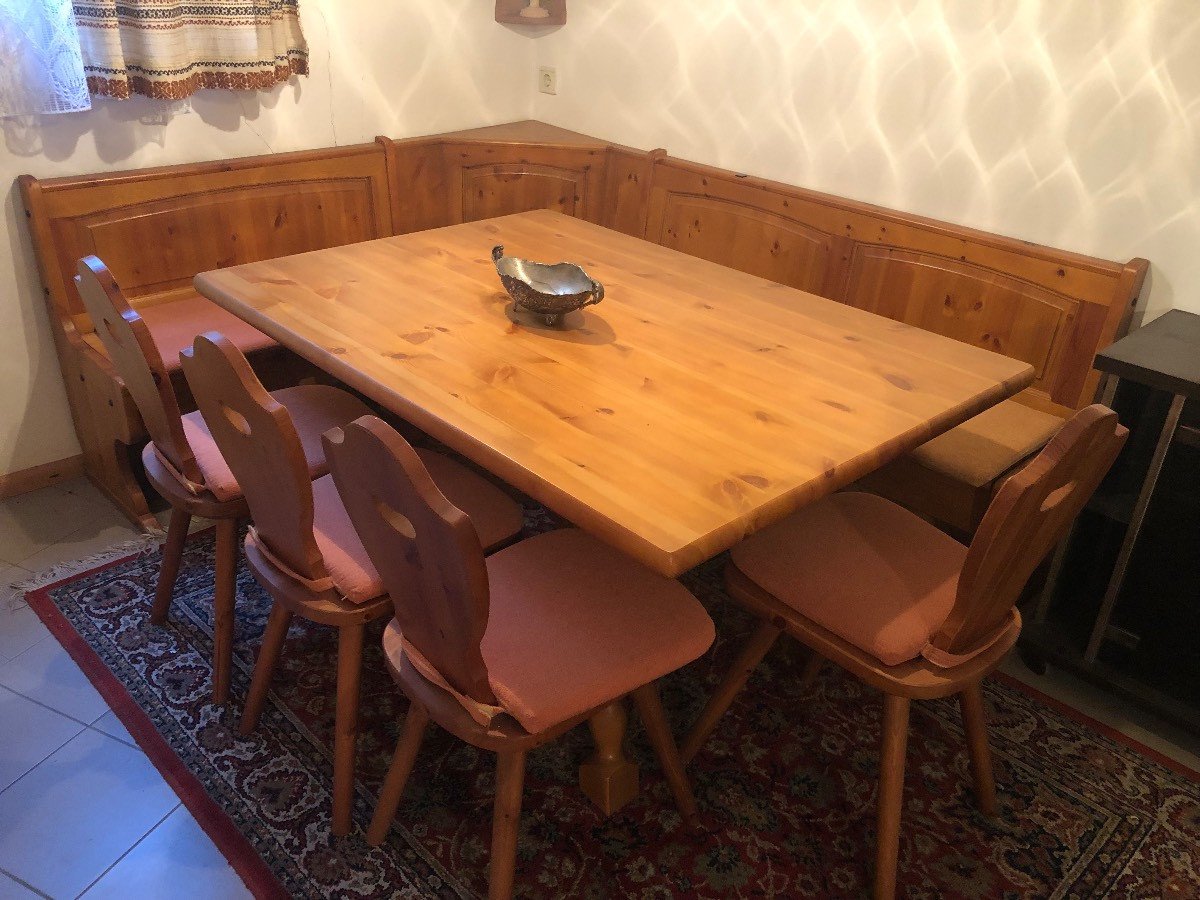 In gutem Zustand sind diese angebotene Möbel. Die Eckbank ist 164cm breit und 204 cm lang, der Tisch ist 140cm lang und 100cm breit die höhe misst 75cm