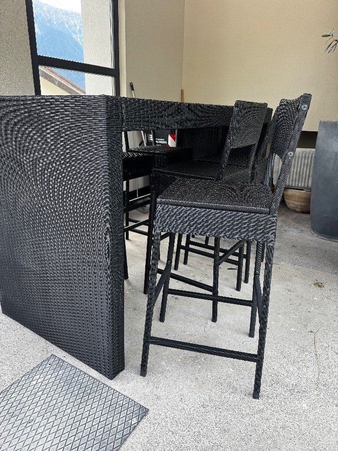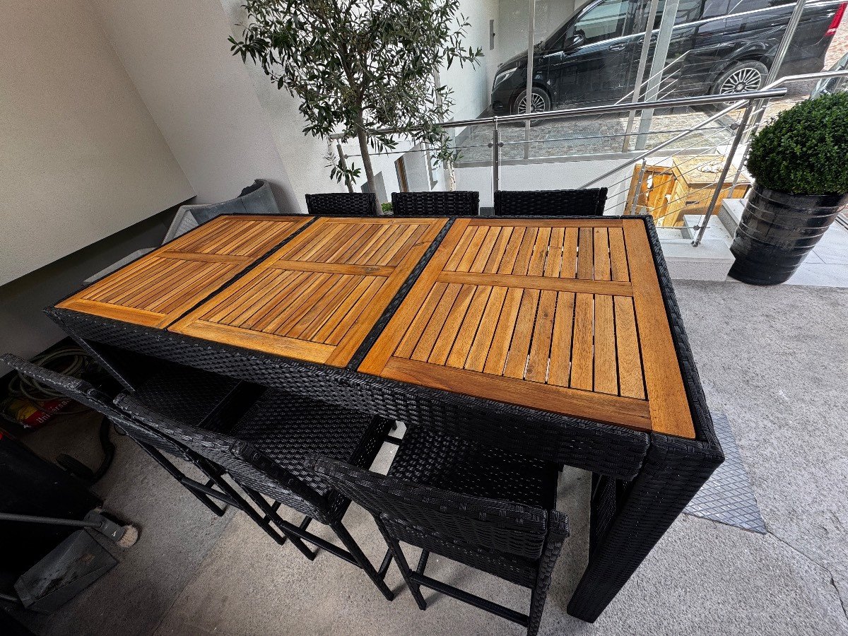 6 Stühle (Achtung einer hat eine geknickte Lehne) mit Tisch. Tischplatten aus Akazienholz.