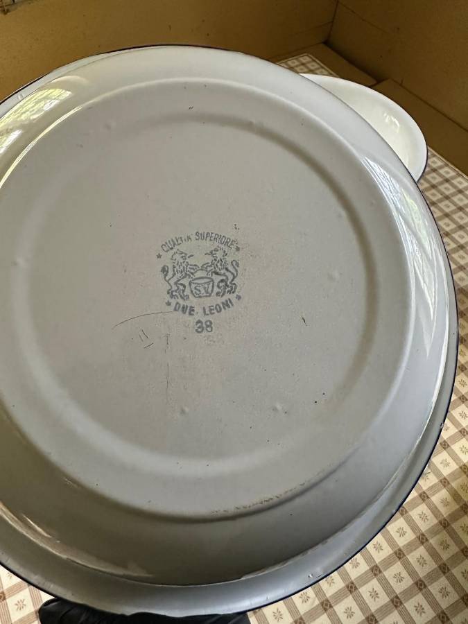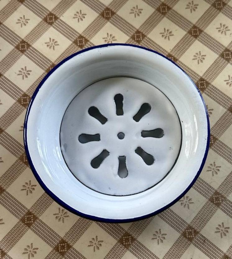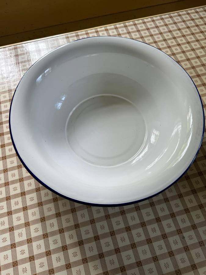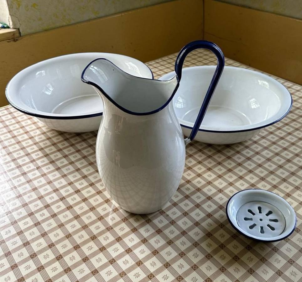 Emaille Waschset, Kanne und Waschschüsseln. Weiß mit blauem Rand.
