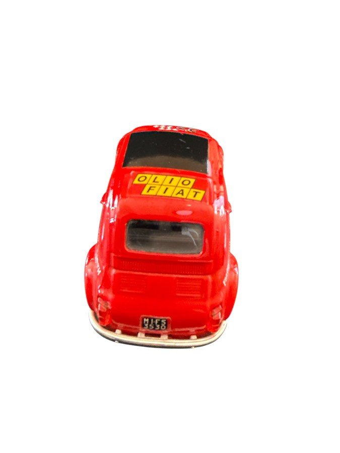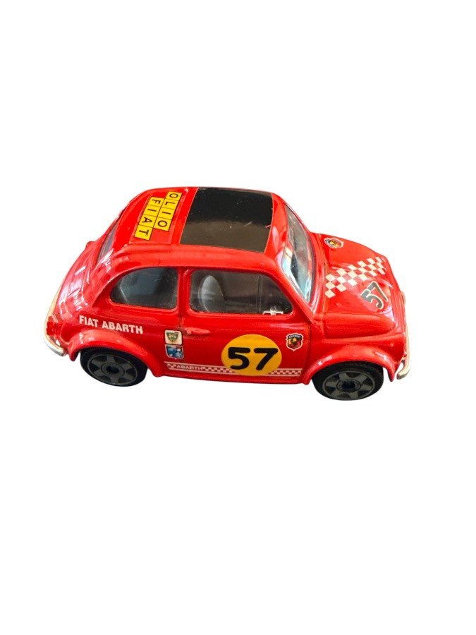 Kleines, sportliches Modell in Weiß mit roten Streifen und Abarth-Logo. Ca. 8 cm lang, gut erhalten.
