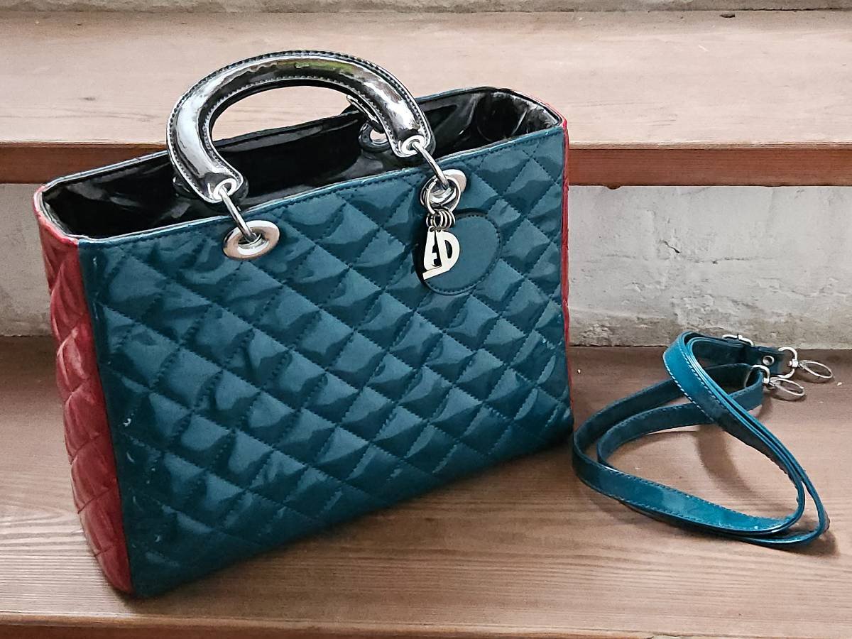 Geräumige, elegante Handtasche aus wetterfestem Kunstleder/Plastik in den Farben Rot-Türkis-Schwarz mit kurzen Griffen und abnehmbarem Gurt zum Umhängen der Tasche. Innen eine verschließbare Seitentasche und zwei Seitenfächer..