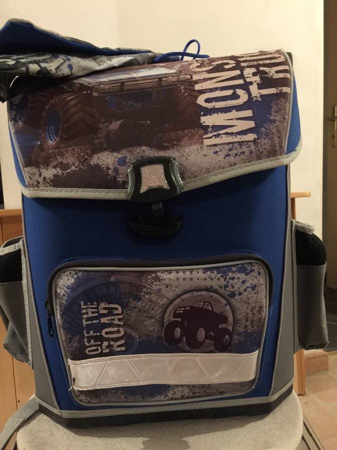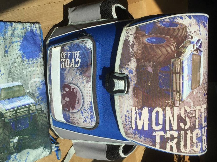 Gut erhaltene Monstertruck Schultasche mit Turnbeutel.