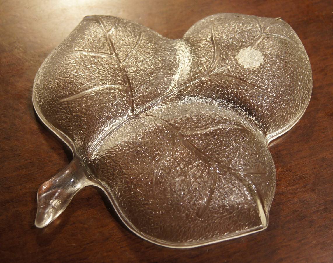 Glasschale in Blattform mit drei Fächern, ideal für Snacks