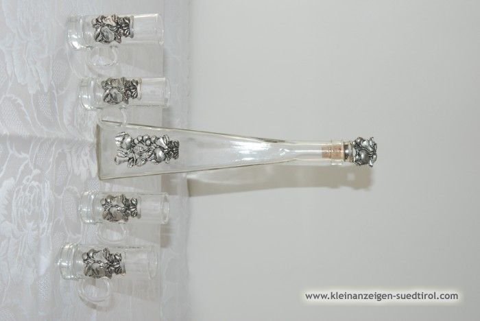 Set bestehend aus viereckiger Flasche mit Zinndekoration an der Flasche und am Korken