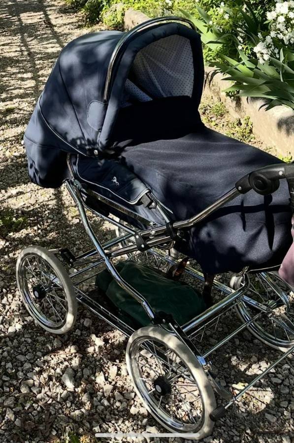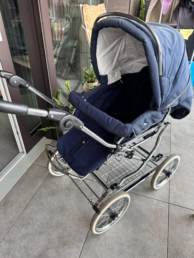 Sehr stylischer HESBA Conder Coupé Kinderwagen mit dem klassischen Look der 80er Jahre und viel Chrom.