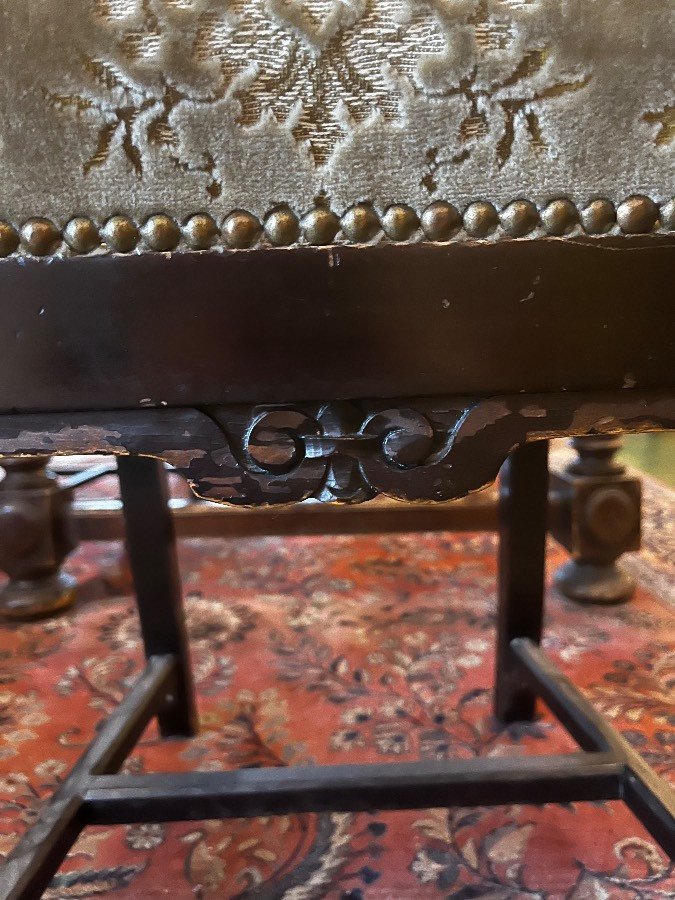 Die Stühle sind aus massivem Holz, mit gedrechselten Beinen und bezogenen Sitzflächen. Der Stoff ist in gutem, gepflegten Zustand, weist aber altersübliche Gebrauchsspuren auf.