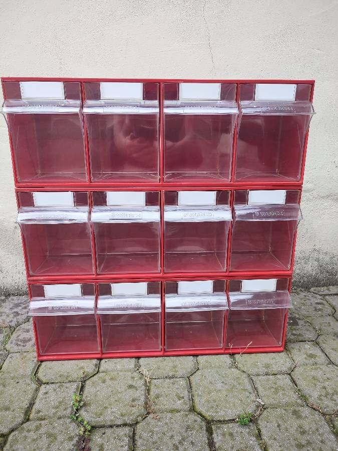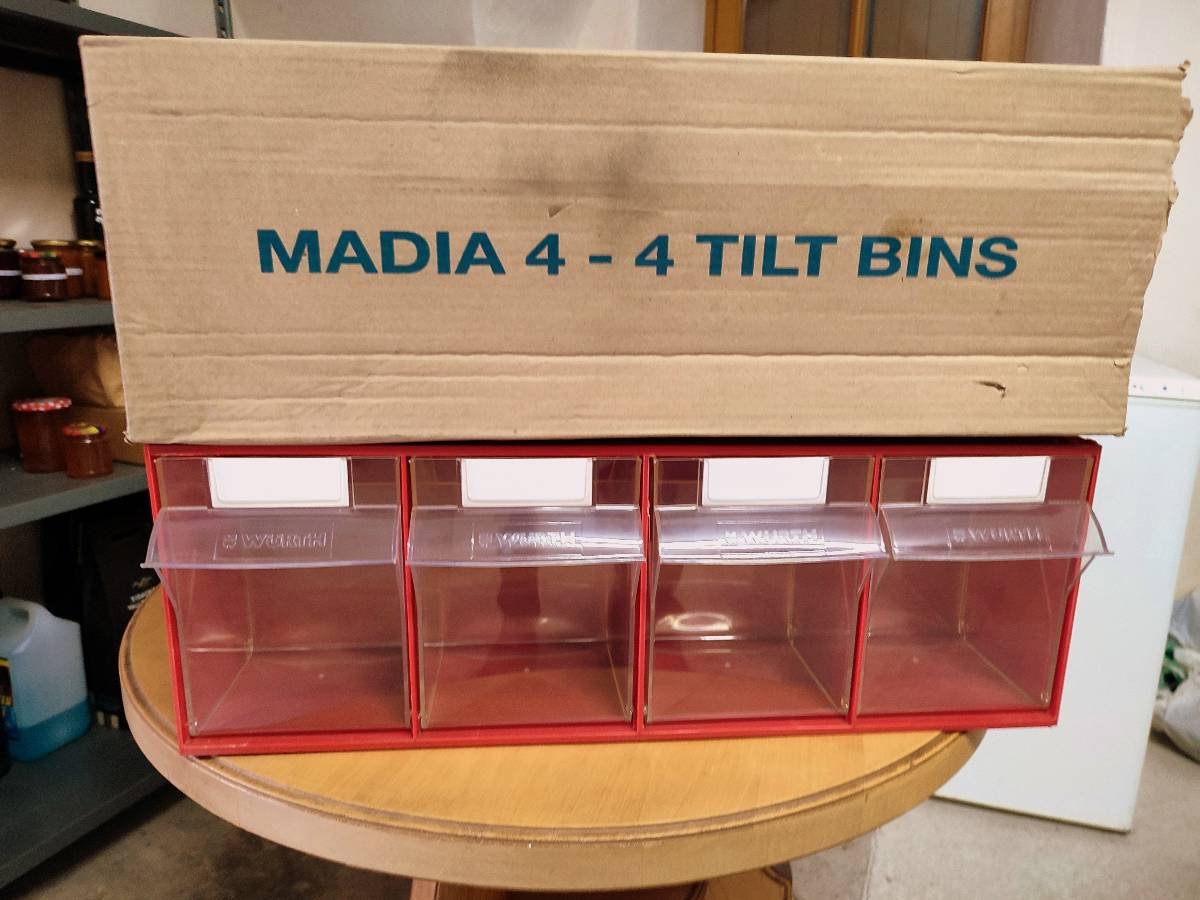 Lagersystem der Firma Madia, drei Boxen mit jeweils vier transparenten Kippbehältern mit Etiketten. Maße: L 60 cm, B 21 cm, H 15 cm, neuwertig