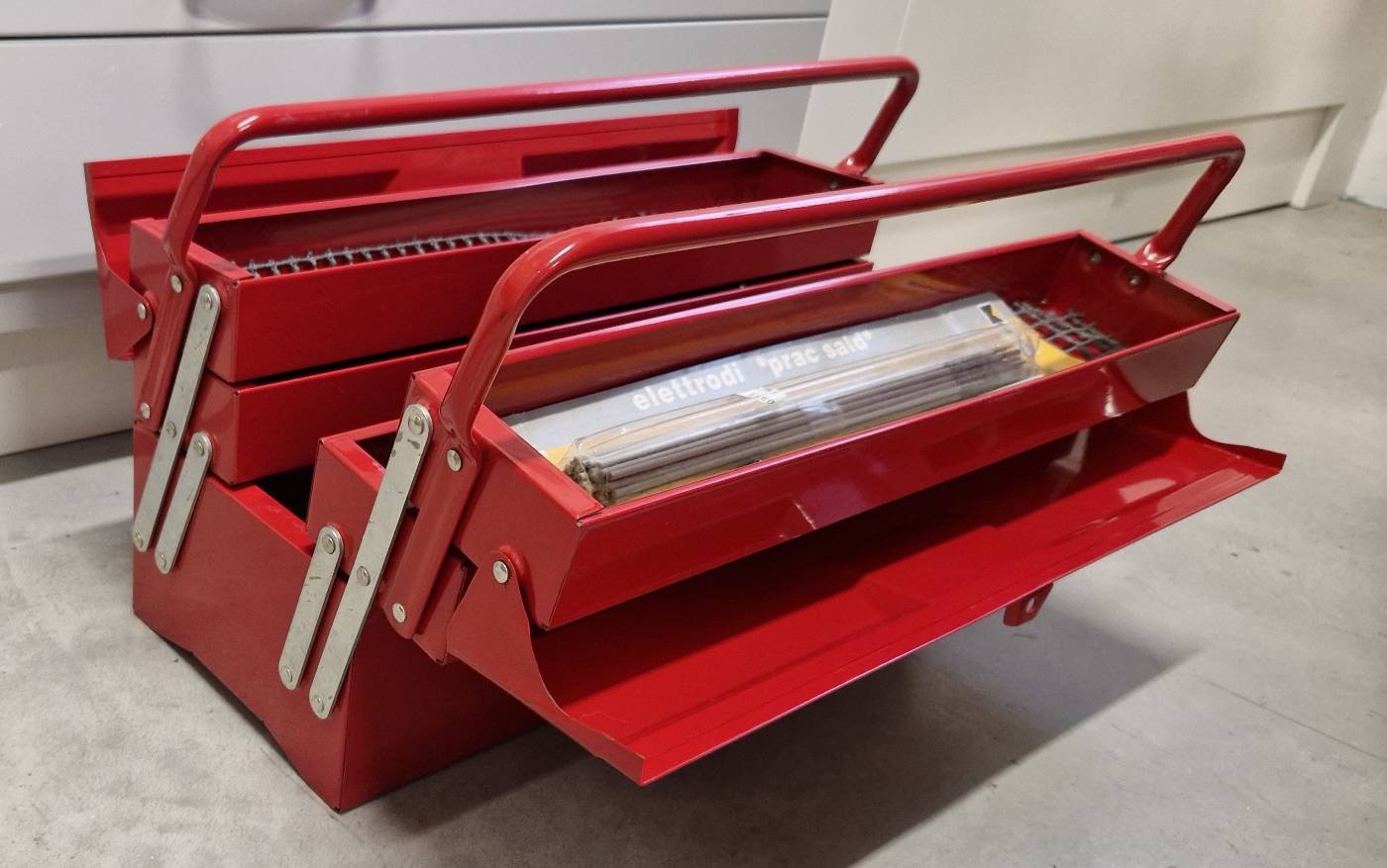 Metall-Werkzeugkiste neu, ca. 50 x 20 x 20 cm mit Antirutschmatten und Schweißelektroden