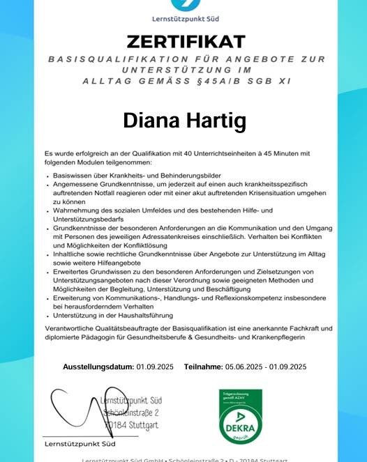 Ich kenne die Betreuung auch aus meinen Privatleben, bis 2023, mit meiner Mutter (verstorben), die ich zunächst Zuhause betreute, bis das leider aufgrund ihrer fortschreitenden Demenz nicht mehr möglich war. Es ist mir ein Bedürfnis, Menschen in solchen Lagen zu unterstützen, swoeit möglich, und ihnen damit einen weiteren Verbleib im heimischen Umfeld zu ermöglichen - und ihnen damit, soweit sinnvoll und machbar, einen nie einfachen Umzug in eine Pflegeeinrichtung zu ersparen. Ich und wir erfuhren leider am Beispiel unserer Mutter, wie so etwas ausgehen kann ...