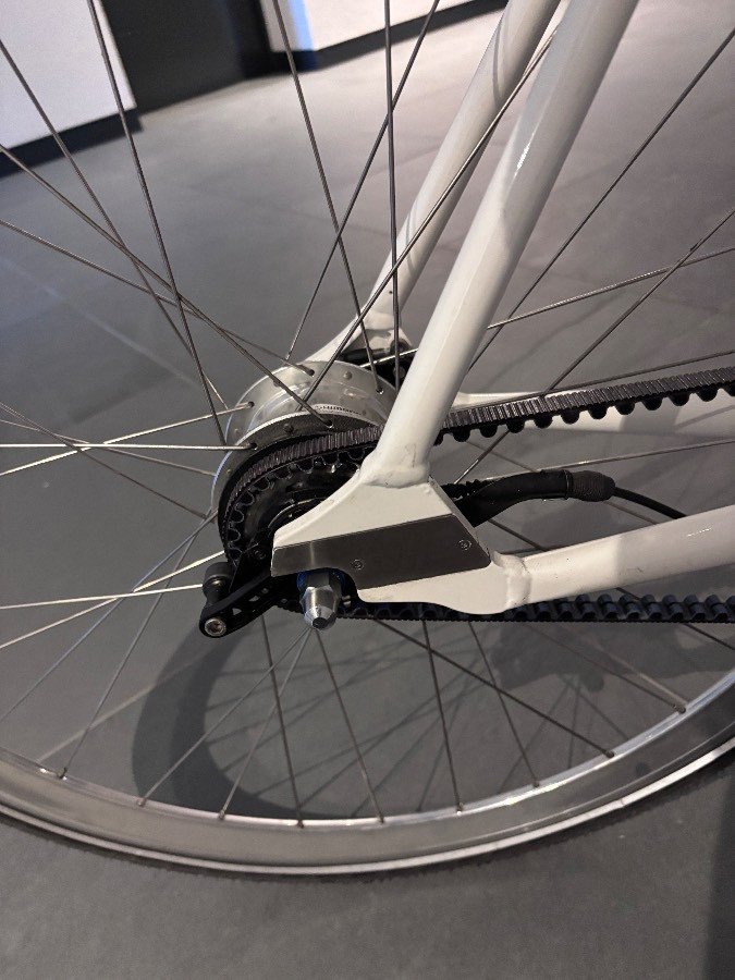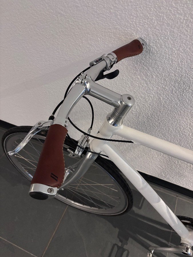 Dieses Fahrrad zeichnet sich durch Ledergriffe aus, sowie dem Schindelhauer-typischen Carbon-Zahnriemen an Stelle der klassischen Kette aus!