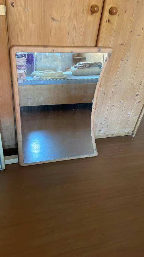 Verkaufe massives Holzbett mit integrierten Nachtkästchen, 6 türigen Kleiderschrank, Regal und Spiegel in sehr gutem Zustand.