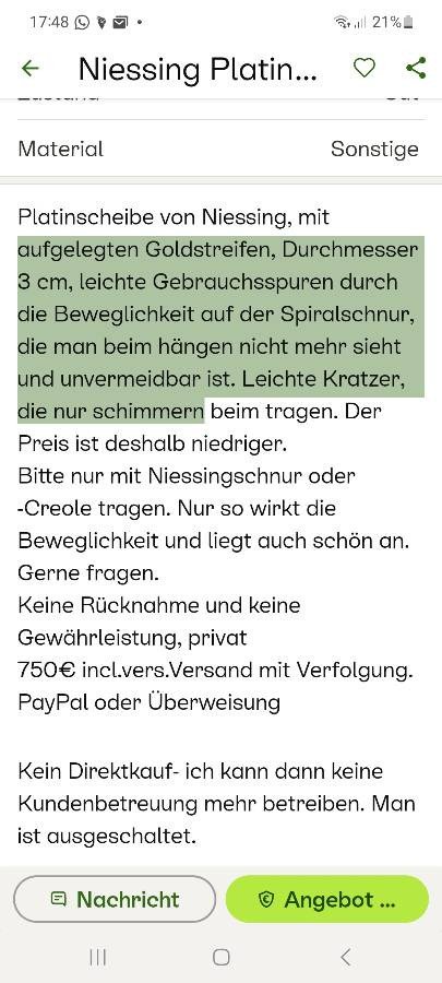Verkaufe originale niessing Scheibe für niessing oder Omega, Bunz Schnur, kaum getragen, wie Neu. Keine Kratzer.
