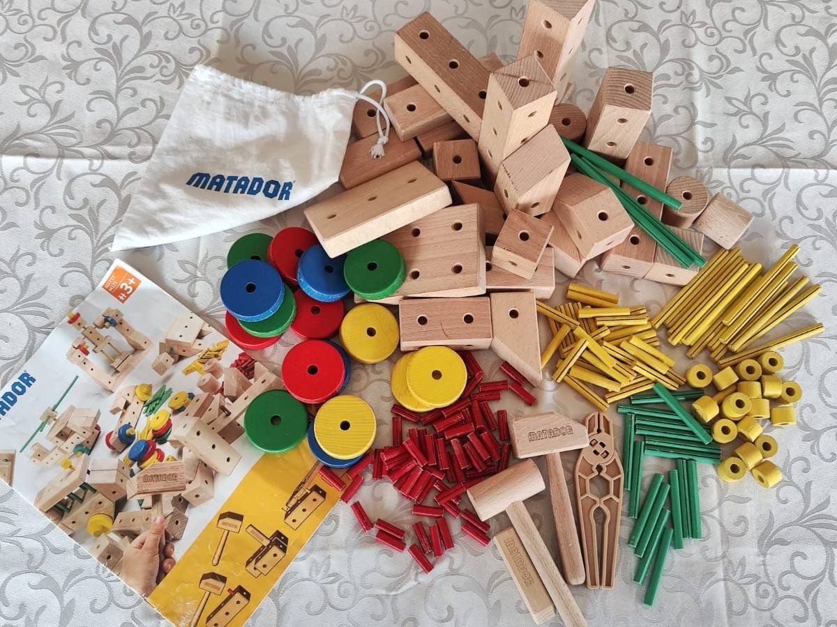Holzbaukasten Matador, ca. 190 Teile (Matador M175 + Zusatzteile), um 70 Euro zu verkaufen (Neupreis 119€).
