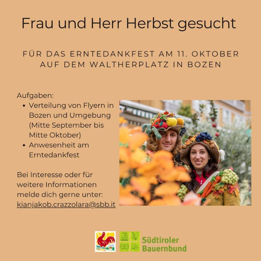 Für das Erntedankfest am Samstag, 11. Oktober 2025 auf dem Bozner Waltherplatz sucht der Südtiroler Bauernbund Frau und Herr Herbst. Die Arbeit wird vergütet.