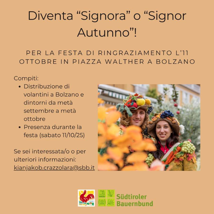 Per la Festa del Ringraziamento l’11 ottobre 2025 in Piazza Walther a Bolzano, l’Unione Agricoltori Sudtirolesi cerca “Signora“ e “Signore Autunno“. È previsto un compenso adeguato.