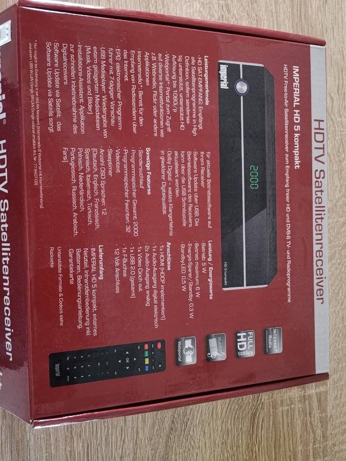 Satellitenreceiver Marke IMPERIAL zum Empfang freier HD und DVB-S-TV und Radioprogramme, inklusiv Fernsteuerung und Kabel