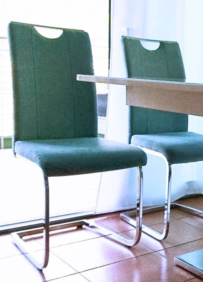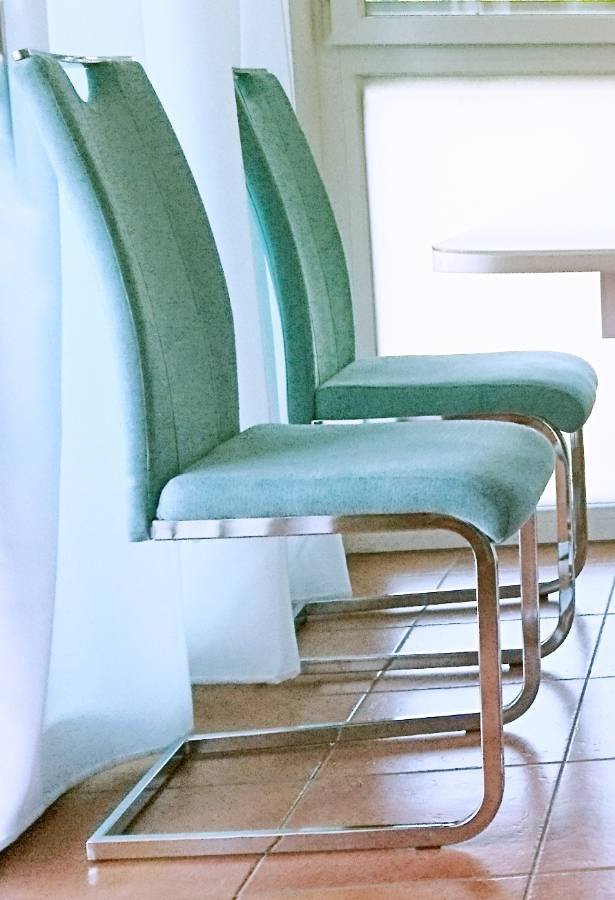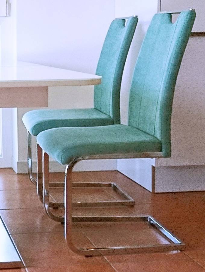 Zwei schöne neuwertige Esszimmer / Wohnzimmer Freuschwinger Stühle mit Stoff-Bezig, Farbe grün- bläulich Türkis Mint. Verchromte Elemente. In Brixen