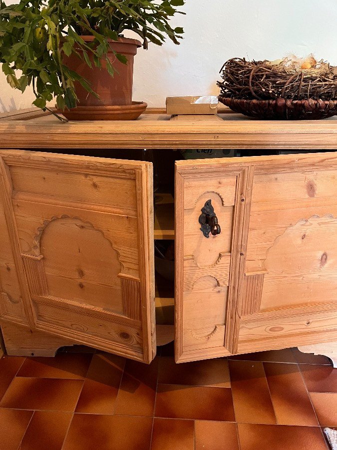 Sie besteht aus massivem Holz (vermutlich Fichte oder Zirbe) und ist mit dekorativen Metallbeschlägen versehen, die ihren rustikalen Charakter unterstreichen.